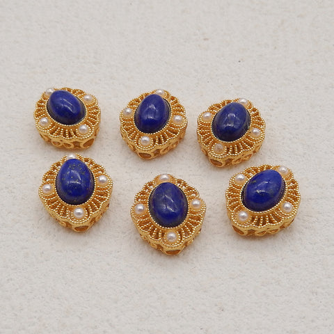 Crafted with a luxurious silver and gold plated finish, each pendant bead features a unique openwork design that gracefully surrounds a charming copper coin-shaped lapis gemstone. This striking combination not only emphasizes the deep blue tones of the lapis but also infuses your creations with powerful symbolism.