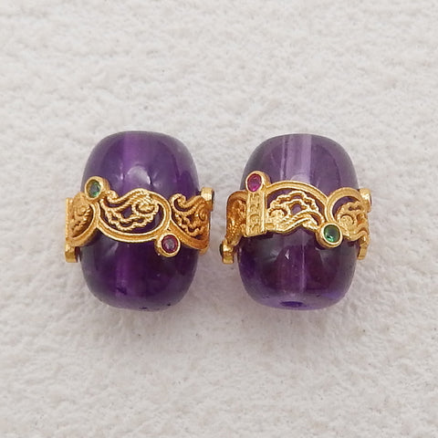 DETAILS & DESIGN:This pair of gold-plated natural gemstone earrings features a stunning cylindrical Amethyst design, showcasing a captivating gradient of purple and black. Encircling the Amethyst is an exquisite gold-plated decoration with a cloud pattern, embellished with small red and green gemstones that enhance the overall elegance. Tailored for high-end individuals, these earrings not only reflect sophisticated taste but also elevate the wearer's aura of sophistication. Additionally, Amethyst is known for its calming properties and ability to boost creativity, making it a perfect accessory for those seeking both style and a touch of confidence.